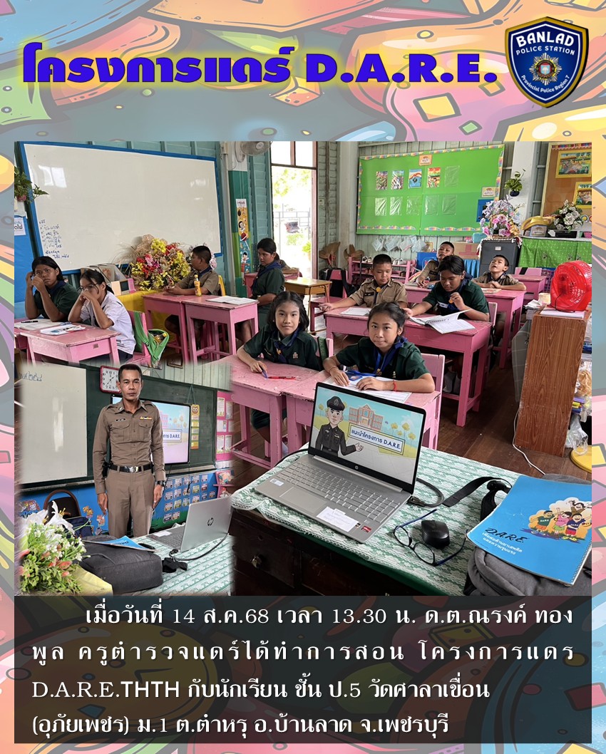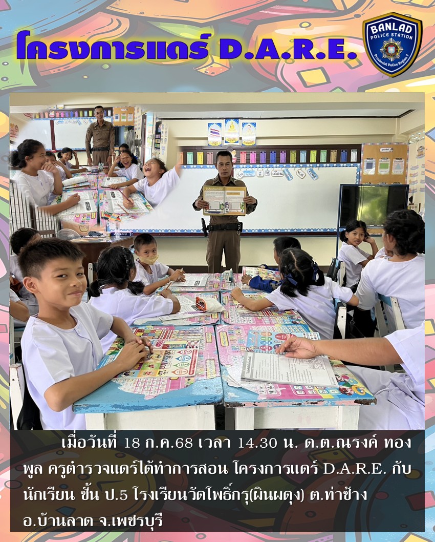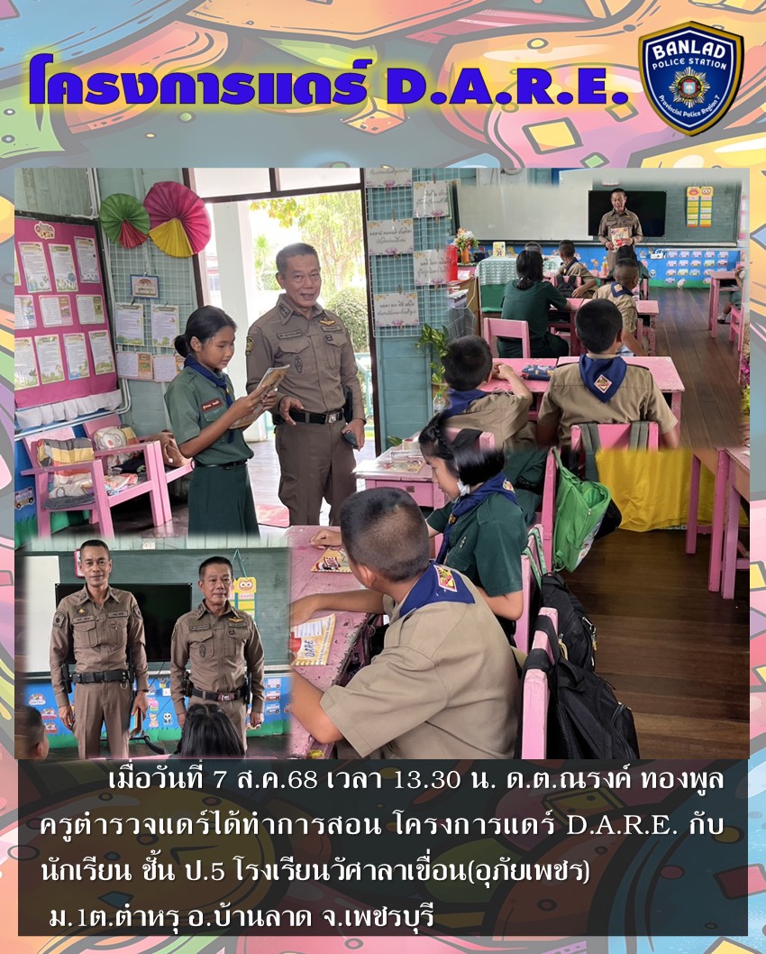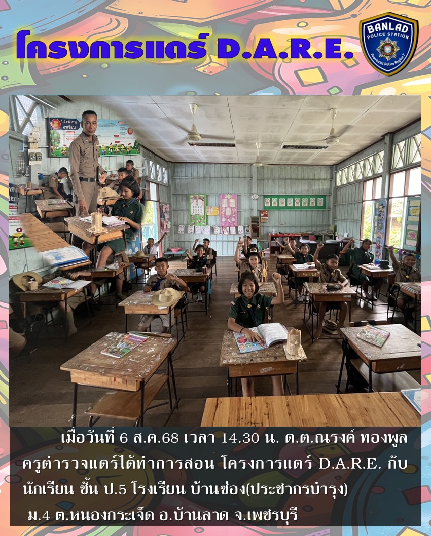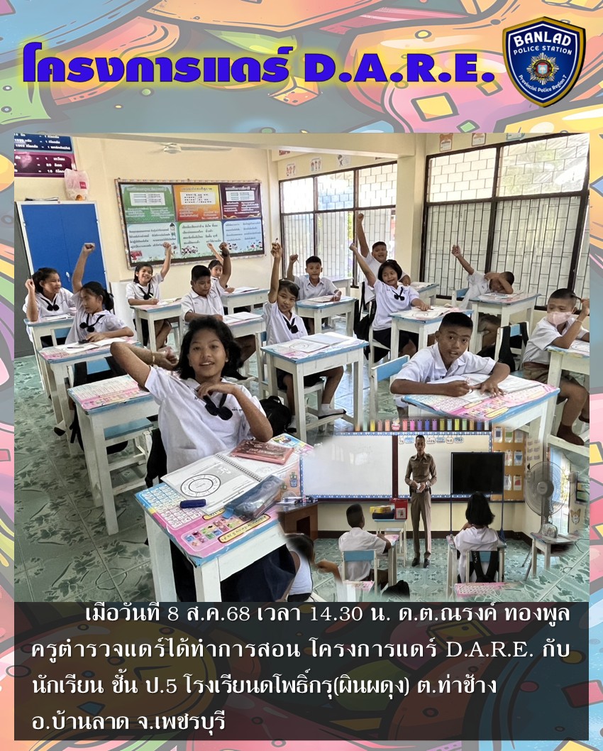 ครูตำรวจแดร์ได้ทำการสอน โครงการแดร์ D.A.R.E. กับนักเรียน ชั้น ป.5 โรงเรียน บ้านซ่อง(ประชากรบำรุง) เมื่อวันที่ 6 ส.ค.68 เวลา 14.30 น. 15 สิงหาคม 2568 โดย ณัฐวุฒิ เมืองขวัญใจ