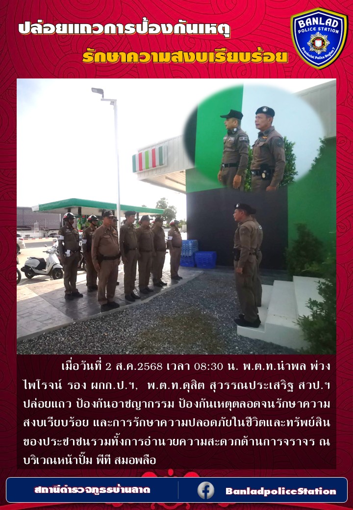 พ.ต.ท.นำพล พ่วงไพโรจน์ รอง ผกก.ป.ฯ, พ.ต.ท.ดุสิต สุวรรณประเสริฐ สวป.ฯ ปล่อยแถว ป้องกันอาชญากรรม ป้องกันเหตุตลอดจนรักษาความสงบเรียบร้อย เมื่อวันที่ 2 ส.ค.2568 เวลา 08:30 น. 5 สิงหาคม 2568 โดย ณัฐวุฒิ เมืองขวัญใจ