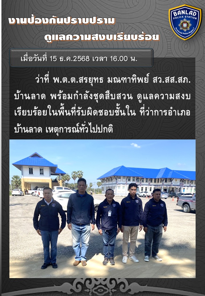 ว่าที่ พ.ต.ต.สรยุทธ มณฑาทิพย์ สว.สส.สภ.บ้านลาด ดูแลความสงบเรียบร้อยในพื้นที่รับผิดชอบ เมื่อวันที่ 15 ธ.ค.2568 เวลา 16.00 น. 19 ธันวาคม 2568 โดย ณัฐวุฒิ เมืองขวัญใจ