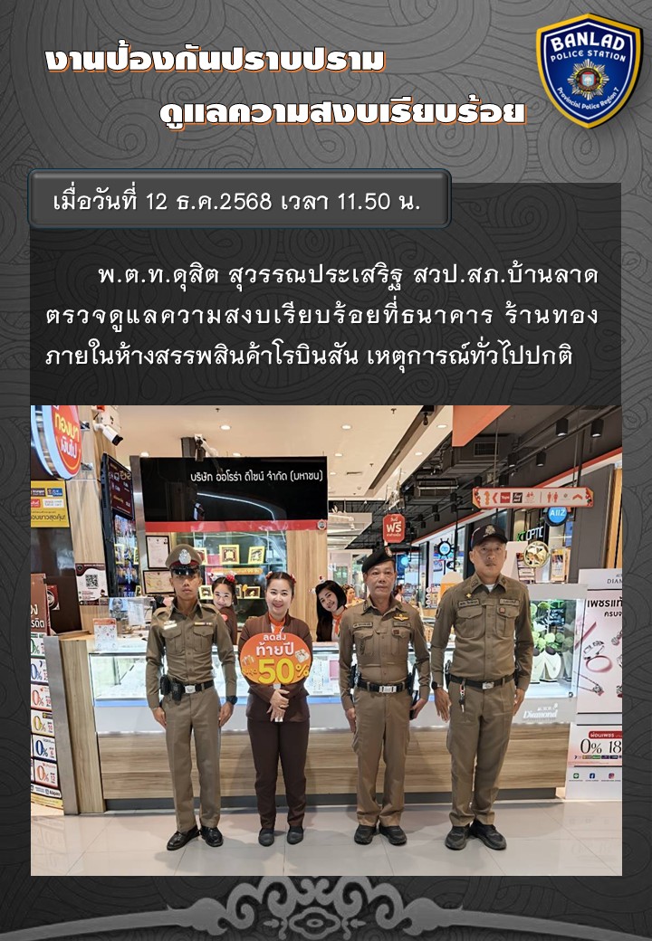 พ.ต.ท.ดุสิต สุวรรณประเสริฐ สวป.สภ.บ้านลาดตรวจดูแลความสงบเรียบร้อย เมื่อวันที่ 12 ธ.ค.2568 เวลา 11.50 น. 19 ธันวาคม 2568 โดย ณัฐวุฒิ เมืองขวัญใจ