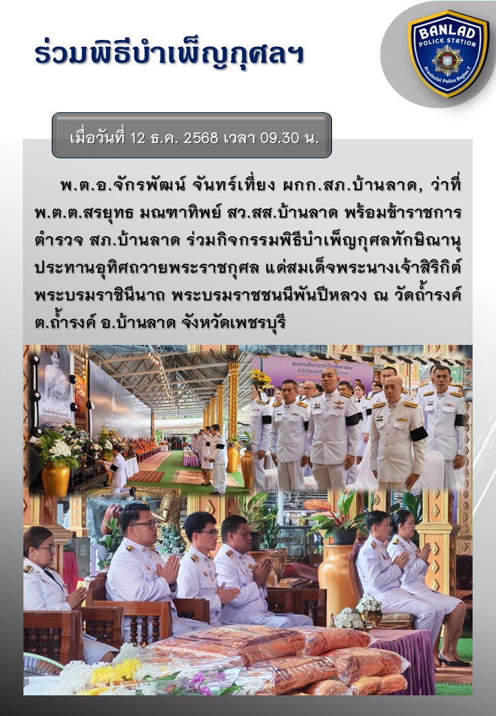 พ.ต.อ.จักรพัฒน์ จันทร์เที่ยง ผกก.สภ.บ้านลาด พร้อมข้าราชการตำรวจ สภ.บ้านลาด ร่วมกิจกรรมพิธีบำเพ็ญกุศลทักษิณานุประทานอุทิศถวายพระราชกุศล แด่สมเด็จพระนางเจ้าสิริกิต์ พระบรมราชินีนาถ พระบรมราชชนนีพันปีหลวง เมื่อวันที่ 12 ธ.ค. 2568 เวลา 09.30 น. 12 ธันวาคม 2568 โดย ณัฐวุฒิ เมืองขวัญใจ