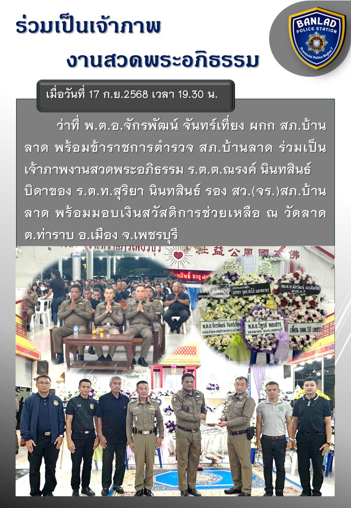 ว่าที่ พ.ต.อ.จักรพัฒน์ จันทร์เที่ยง ผกก สภ.บ้านลาด ร่วมเป็นเจ้าภาพงานสวดพระอภิธรรม ร.ต.ต.ณรงค์ นินทสินธ์ บิดาของ ร.ต.ท.สุริยา นินทสินธ์ รอง สว.(จร.)สภ.บ้านลาด เมื่อวันที่ 17 ก.ย.2568 เวลา 19.30 น. 24 กันยายน 2568 โดย ณัฐวุฒิ เมืองขวัญใจ