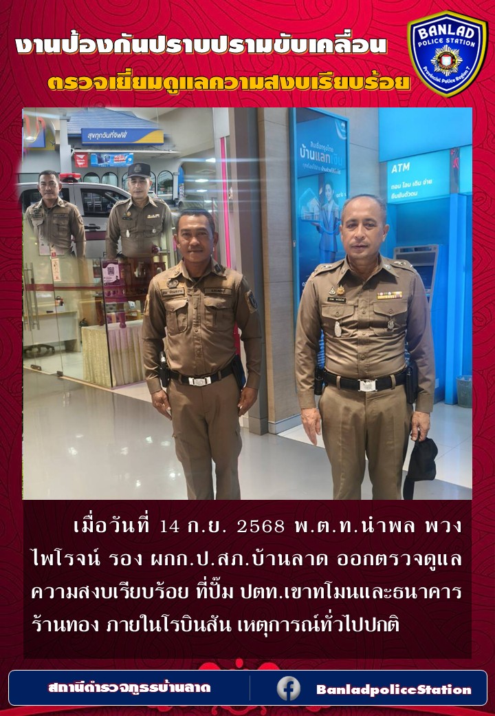 พ.ต.ท.นำพล พวงไพโรจน์ รอง ผกก.ป.สภ.บ้านลาด ออกตรวจดูแลความสงบเรียบร้อย เมื่อวันที่ 14 ก.ย. 2568 16 กันยายน 2568 โดย ณัฐวุฒิ เมืองขวัญใจ