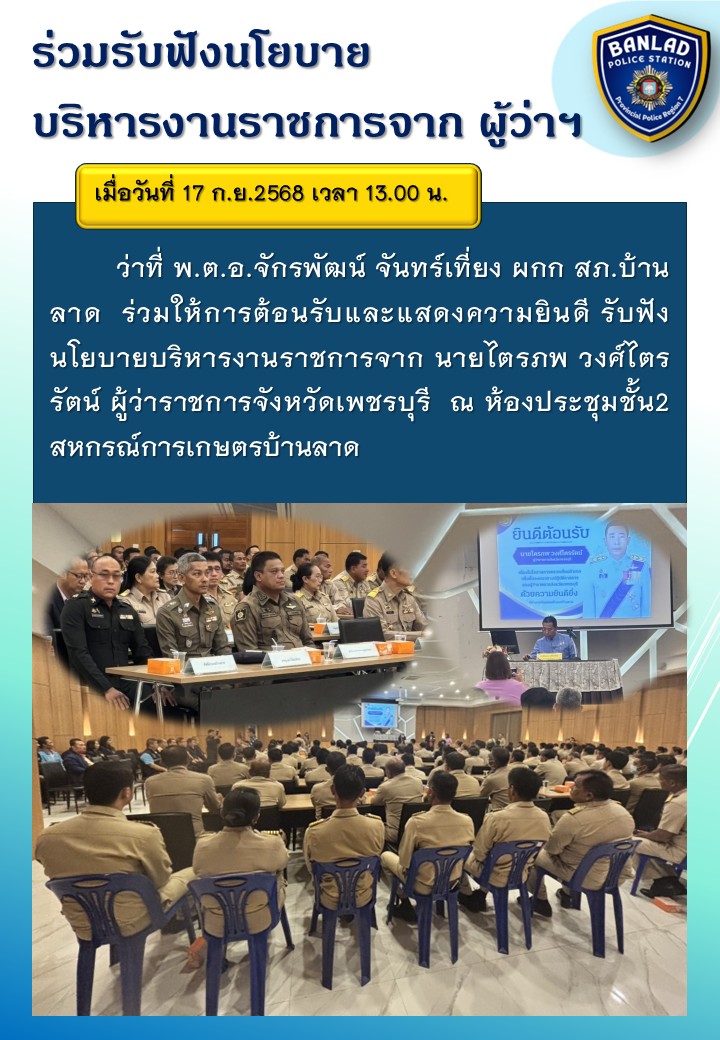 ว่าที่ พ.ต.อ.จักรพัฒน์ จันทร์เที่ยง ผกก สภ.บ้านลาด ร่วมรับฟังนโยบายบริหารงานราชการจาก นายไตรภพ วงศ์ไตรรัตน์ ผู้ว่าราชการจังหวัดเพชรบุรี เมื่อวันที่ 17 ก.ย.2568 เวลา 13.00 น. 24 กันยายน 2568 โดย ณัฐวุฒิ เมืองขวัญใจ