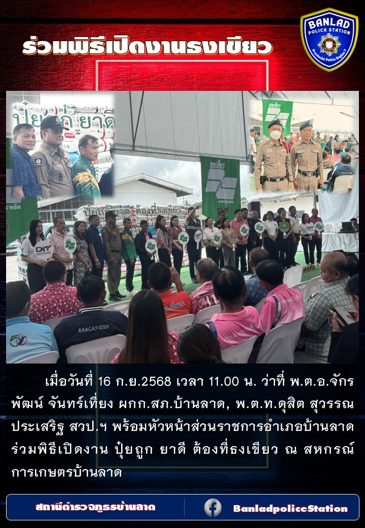 ว่าที่ พ.ต.อ.จักรพัฒน์ จันทร์เที่ยง ผกก.สภ.บ้านลาด, พ.ต.ท.ดุสิต สุวรรณประเสริฐ สวป.ฯ ร่วมพิธีเปิดงาน ปุ๋ยถูก ยาดี ต้องที่ธงเขียว เมื่อวันที่ 16 ก.ย.2568 เวลา 11.00 น. 24 กันยายน 2568 โดย ณัฐวุฒิ เมืองขวัญใจ