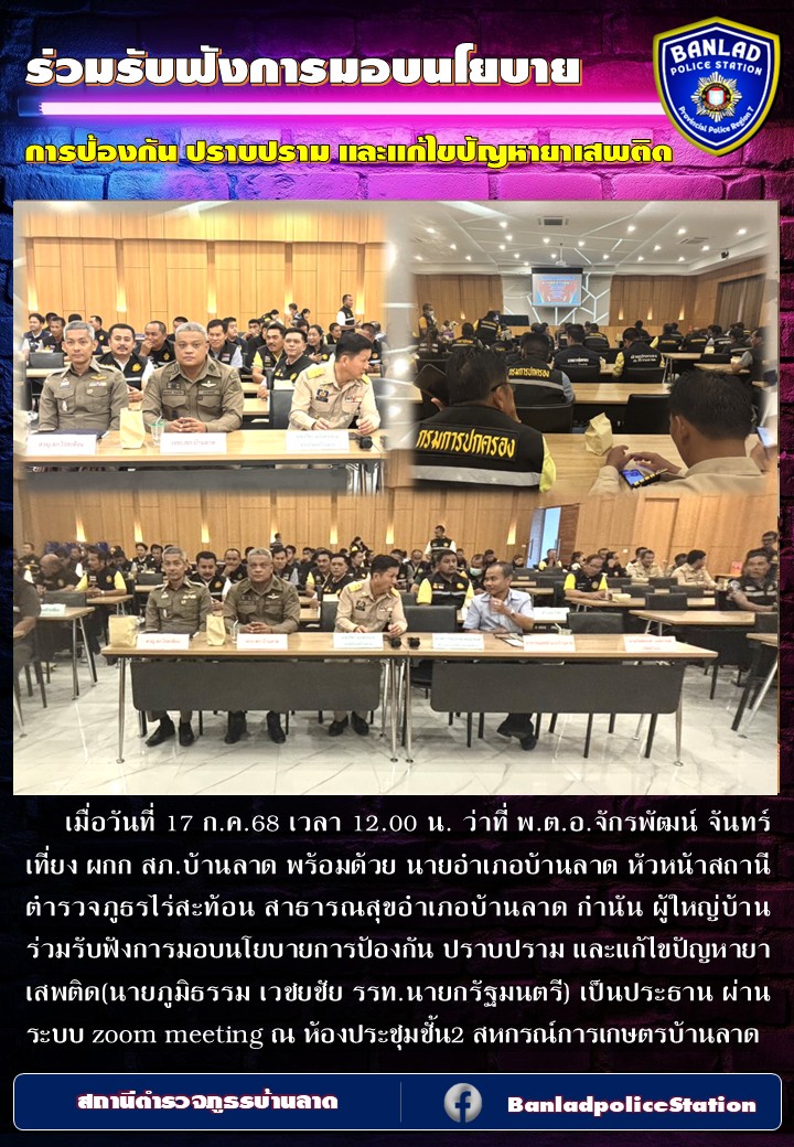 ว่าที่ พ.ต.อ.จักรพัฒน์ จันทร์เที่ยง ผกก สภ.บ้านลาด ร่วมรับฟังการมอบนโยบายการป้องกัน ปราบปราม และแก้ไขปัญหายาเสพติด เมื่อวันที่ 17 ก.ค.68 เวลา 12.00 น. 23 กรกฎาคม 2568 โดย ณัฐวุฒิ เมืองขวัญใจ