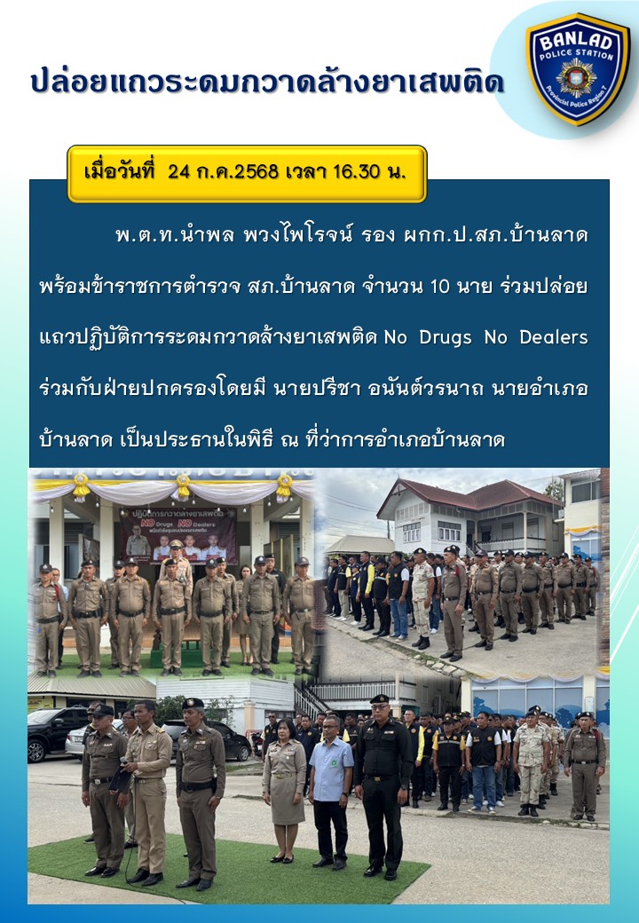 พ.ต.ท.นำพล พวงไพโรจน์ รอง ผกก.ป.สภ.บ้านลาด ร่วมปล่อยแถวปฏิบัติการระดมกวาดล้างยาเสพติด No Drugs No Dealers เมื่อวันที่ 24 ก.ค.2568 เวลา 16.30 น. 30 กรกฎาคม 2568 โดย ณัฐวุฒิ เมืองขวัญใจ