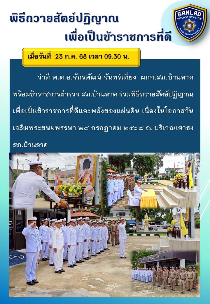 ว่าที่ พ.ต.อ.จักรพัฒน์ จันทร์เที่ยง ผกก.สภ.บ้านลาดพร้อมข้าราชการตำรวจ สภ.บ้านลาด ร่วมพิธีถวายสัตย์ปฏิญาณเพื่อเป็นข้าราชการที่ดีและพลังของแผ่นดิน เมื่อวันที่ 23 ก.ค. 68 เวลา 09.30 น. 23 กรกฎาคม 2568 โดย ณัฐวุฒิ เมืองขวัญใจ