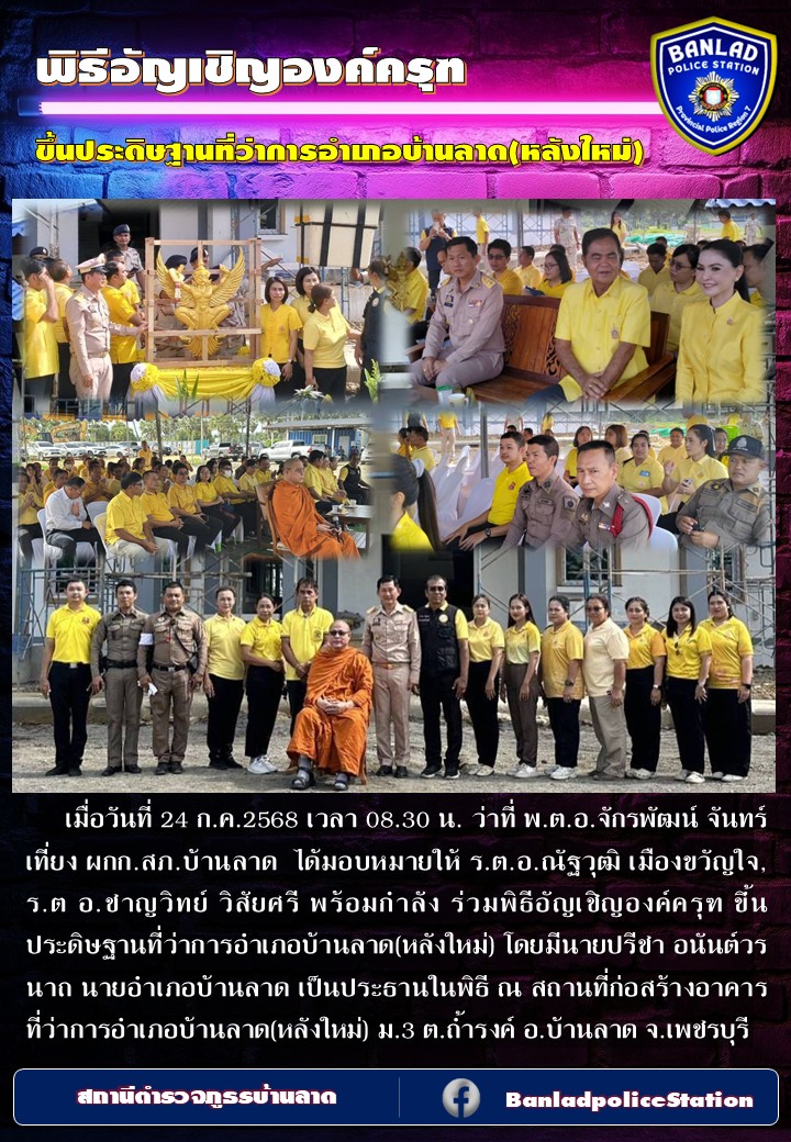ร่วมพิธีอัญเชิญองค์ครุฑ ขึ้นประดิษฐานที่ว่าการอำเภอบ้านลาด(หลังใหม่) เมื่อวันที่ 24 ก.ค.2568 เวลา 08.30 น. 30 กรกฎาคม 2568 โดย ณัฐวุฒิ เมืองขวัญใจ