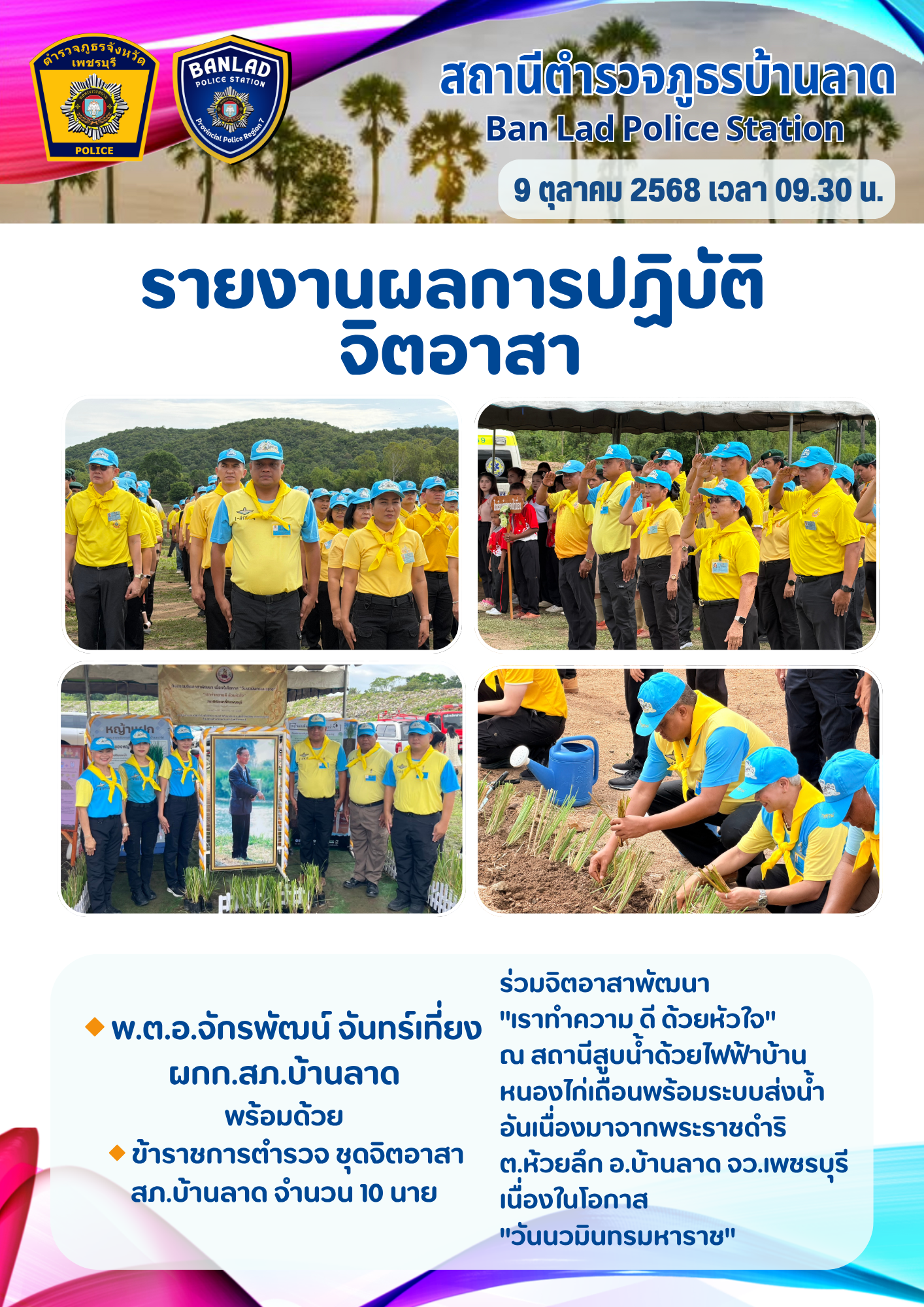 ว่าที่ พ.ต.อ.จักรพัฒน์ จันทร์เที่ยง ผกก.สภ.บ้านลาด ร่วมจิตอาสาพัฒนา “เราทำความ ดี ด้วยหัวใจ” ปลูกหญ้าแฝก เมื่อวันที่ 9 ต.ค. 2568 เวลา 09.30 น. 10 ตุลาคม 2568 โดย ณัฐวุฒิ เมืองขวัญใจ