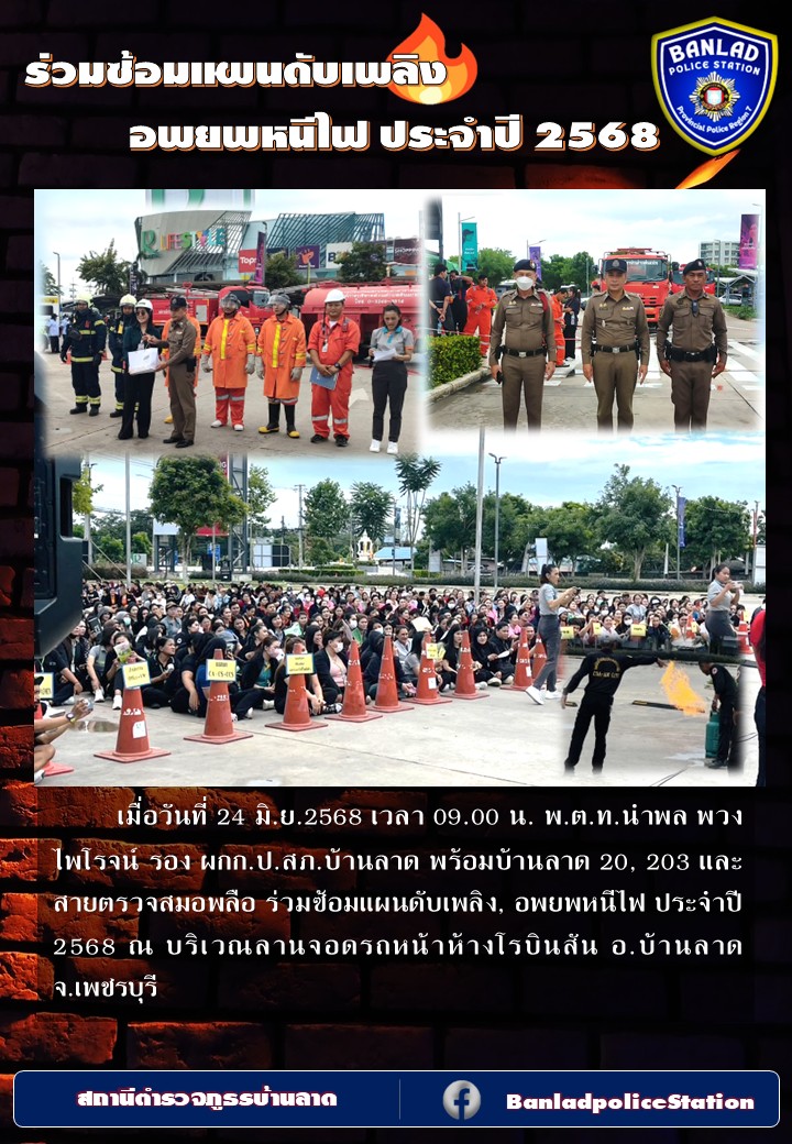 น. พ.ต.ท.นำพล พวงไพโรจน์ รอง ผกก.ป.สภ.บ้านลาด ร่วมซ้อมแผนดับเพลิง, อพยพหนีไฟ ประจำปี 2568 เมื่อวันที่ 24 มิ.ย.2568 เวลา 09.00 น. 24 มิถุนายน 2568 โดย ณัฐวุฒิ เมืองขวัญใจ