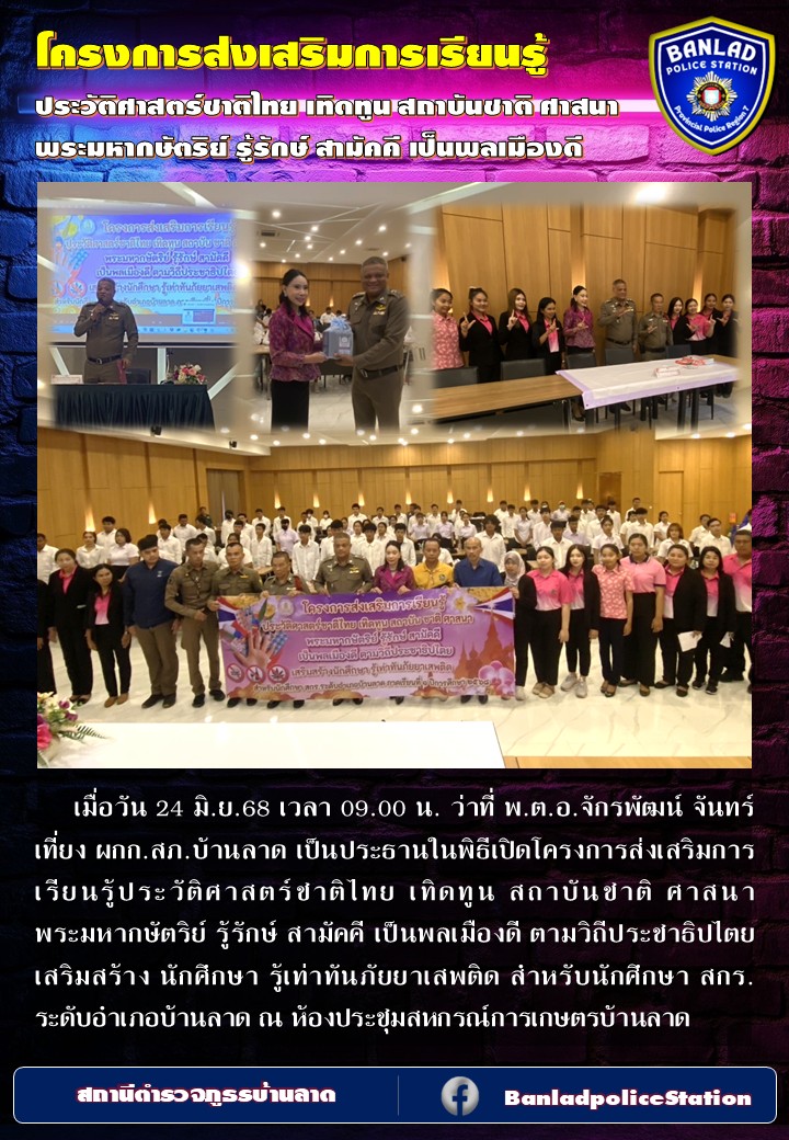 ว่าที่ พ.ต.อ.จักรพัฒน์ จันทร์เที่ยง ผกก.สภ.บ้านลาด เป็นประธานในพิธีเปิดโครงการส่งเสริมการเรียนรู้ประวัติศาสตร์ชาติไทยฯ เมื่อวัน 24 มิ.ย.68 เวลา 09.00 น. 24 มิถุนายน 2568 โดย ณัฐวุฒิ เมืองขวัญใจ
