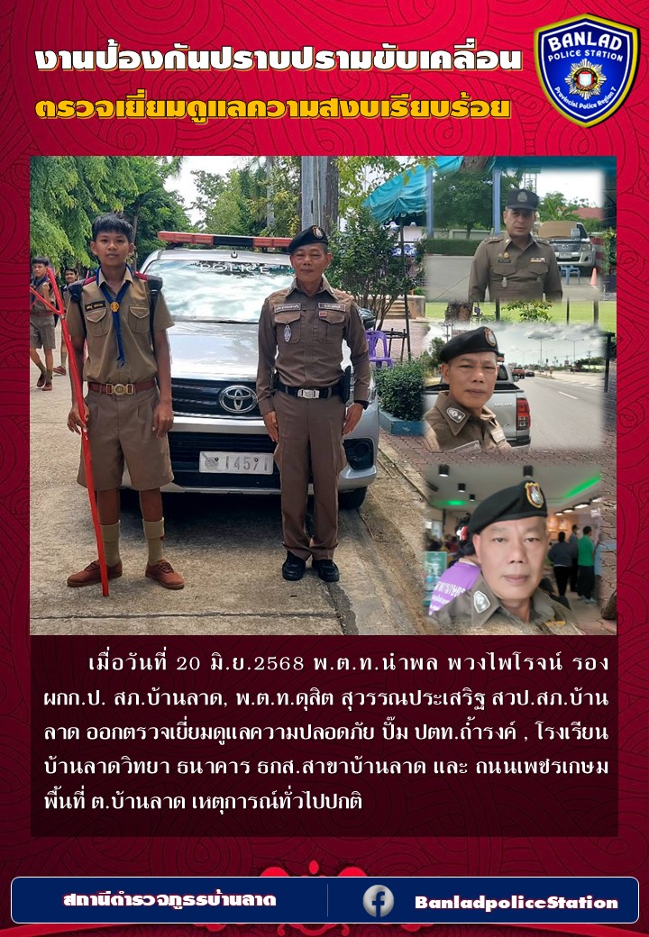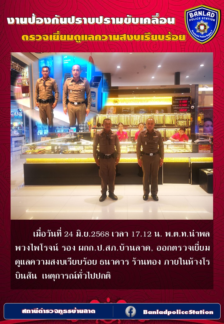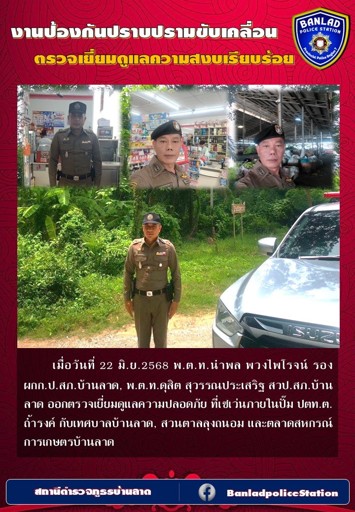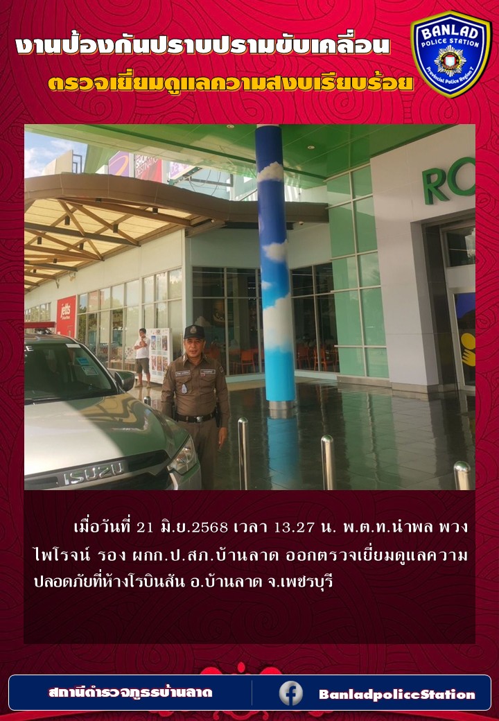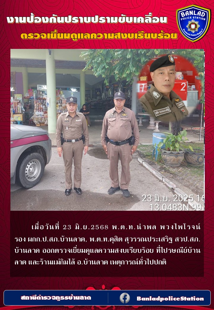 พ.ต.ท.นำพล พวงไพโรจน์ รอง ผกก.ป.สภ.บ้านลาด ออกตรวจเยี่ยมดูแลความสงบเรียบร้อย เมื่อวันที่ 24 มิ.ย.2568 เวลา 17.12 น. 30 มิถุนายน 2568 โดย ณัฐวุฒิ เมืองขวัญใจ