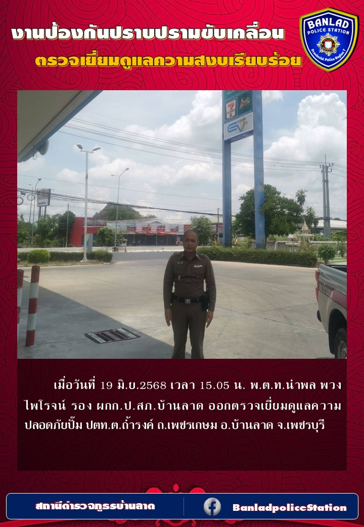 พ.ต.ท.นำพล พวงไพโรจน์ รอง ผกก.ป.สภ.บ้านลาด ออกตรวจเยี่ยมดูแลความปลอดภัยปั๊ม ปตท.ต.ถ้ำรงค์ เมื่อวันที่ 19 มิ.ย.2568 เวลา 15.05 น. 24 มิถุนายน 2568 โดย ณัฐวุฒิ เมืองขวัญใจ