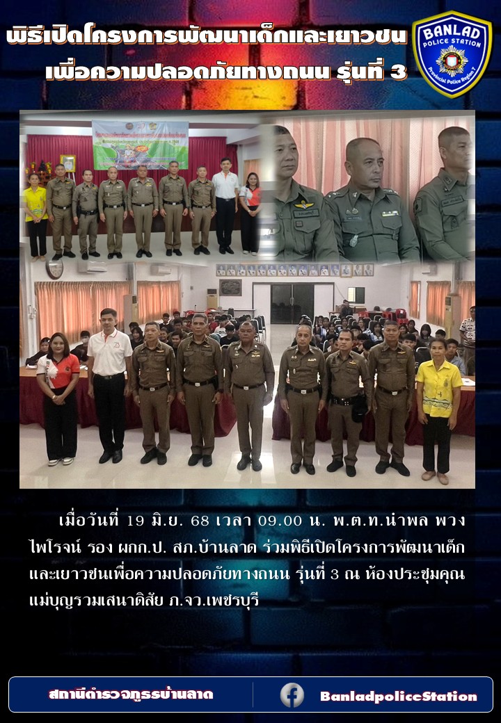 น. พ.ต.ท.นำพล พวงไพโรจน์ รอง ผกก.ป. สภ.บ้านลาด ร่วมพิธีเปิดโครงการพัฒนาเด็กและเยาวชนเพื่อความปลอดภัยทางถนน รุ่นที่ 3 เมื่อวันที่ 19 มิ.ย. 68 เวลา 09.00 น. 24 มิถุนายน 2568 โดย ณัฐวุฒิ เมืองขวัญใจ