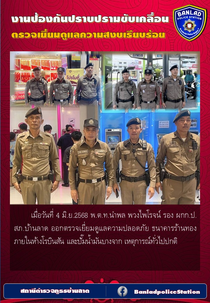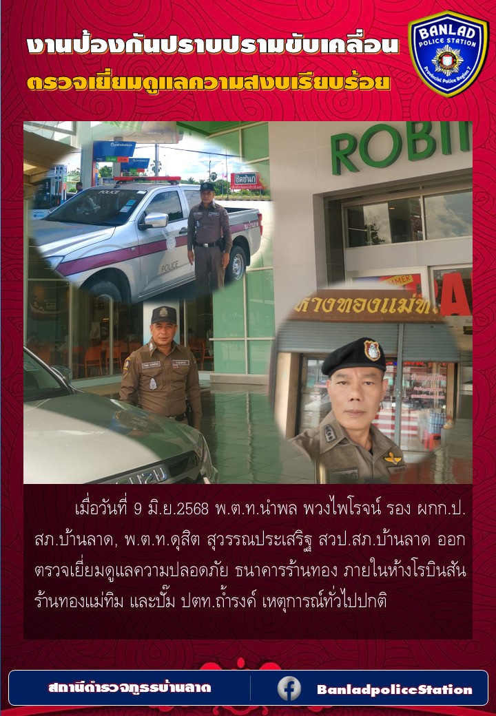 พ.ต.ท.นำพล พวงไพโรจน์ รอง ผกก.ป. สภ.บ้านลาด ออกตรวจเยี่ยมดูแลความปลอดภัย ธนาคารร้านทอง ภายในห้างโรบินสัน และปั๊มน้ำมันบางจาก เมื่อวันที่ 4 มิ.ย.2568 6 มิถุนายน 2568 โดย ณัฐวุฒิ เมืองขวัญใจ