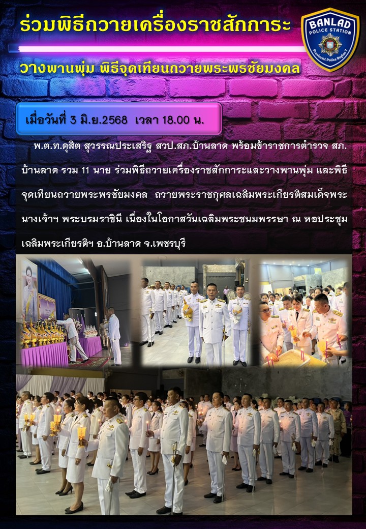 พ.ต.ท.ดุสิต สุวรรณประเสริฐ สวป.สภ.บ้านลาด พร้อมข้าราชการตำรวจ สภ.บ้านลาด ร่วมพิธีถวายเครื่องราชสักการะและวางพานพุ่ม และพิธีจุดเทียนถวายพระพรชัยมงคล เมื่อวันที่ 3 มิ.ย.2568 เวลา 18.00 น. 4 มิถุนายน 2568 โดย ณัฐวุฒิ เมืองขวัญใจ
