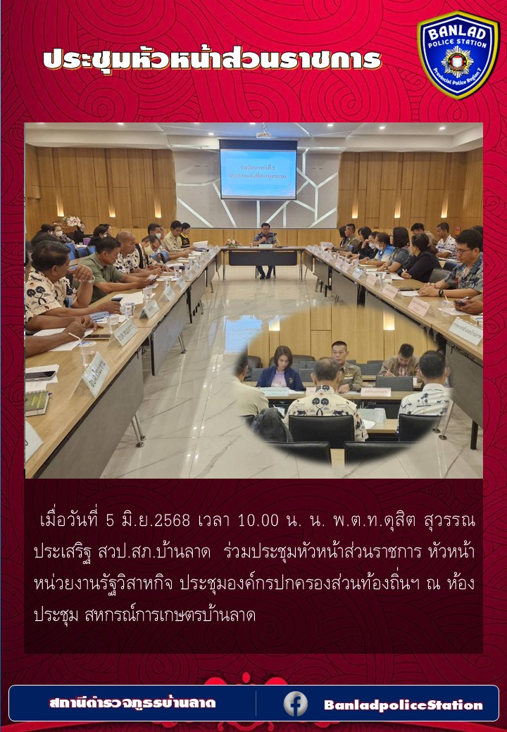 พ.ต.ท.ดุสิต สุวรรณประเสริฐ สวป.สภ.บ้านลาด ร่วมประชุมหัวหน้าส่วนราชการ เมื่อวันที่ 5 มิ.ย.2568 เวลา 10.00 น. 6 มิถุนายน 2568 โดย ณัฐวุฒิ เมืองขวัญใจ