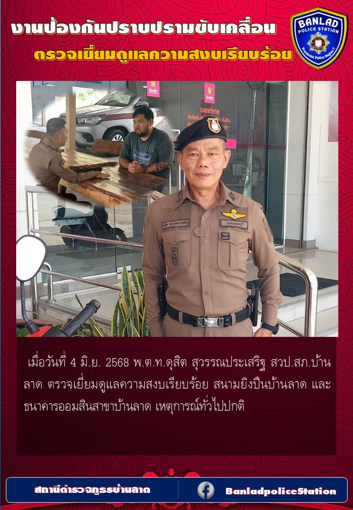 พ.ต.ท.ดุสิต สุวรรณประเสริฐ สวป.สภ.บ้านลาด ตรวจเยี่ยมดูแลความสงบเรียบร้อย สนามยิงปืนบ้านลาด และธนาคารออมสินสาขาบ้านลาด เมื่อวันที่ 4 มิ.ย. 2568 6 มิถุนายน 2568 โดย ณัฐวุฒิ เมืองขวัญใจ