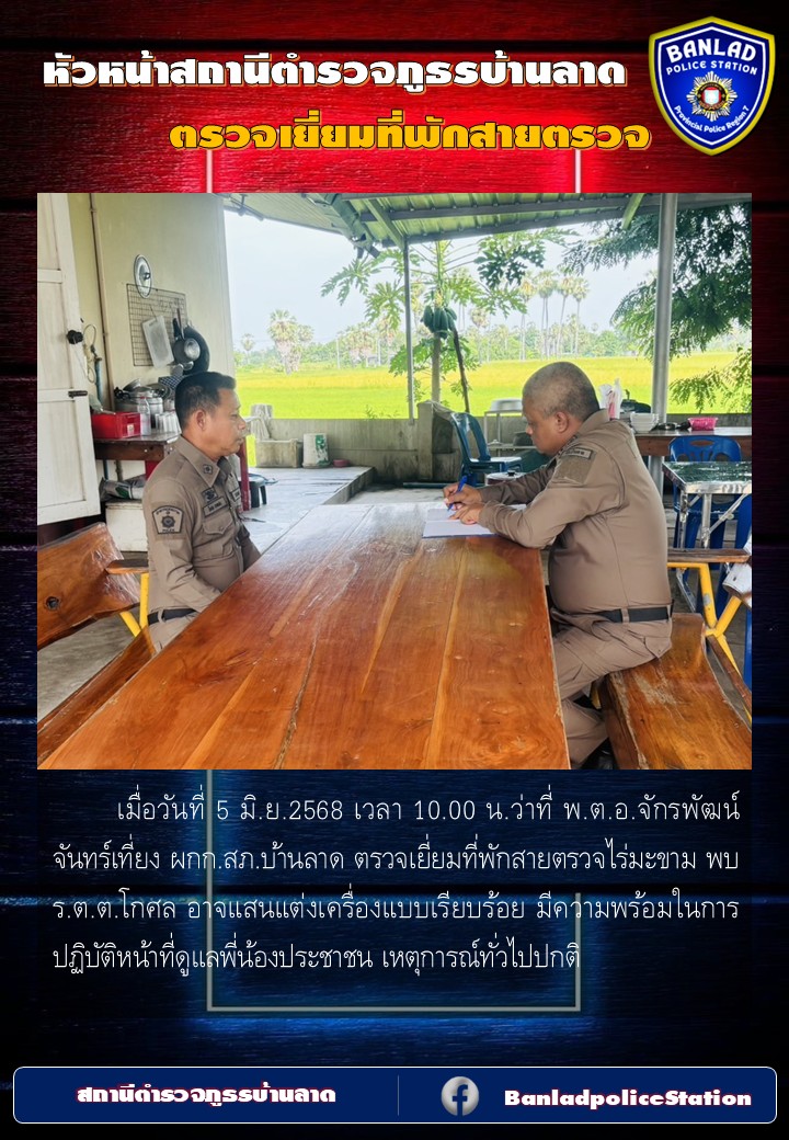 ว่าที่ พ.ต.อ.จักรพัฒน์ จันทร์เที่ยง ผกก.สภ.บ้านลาด ตรวจเยี่ยมที่พักสายตรวจไร่มะขาม เมื่อวันที่ 5 มิ.ย.2568 เวลา 10.00 น. 6 มิถุนายน 2568 โดย ณัฐวุฒิ เมืองขวัญใจ