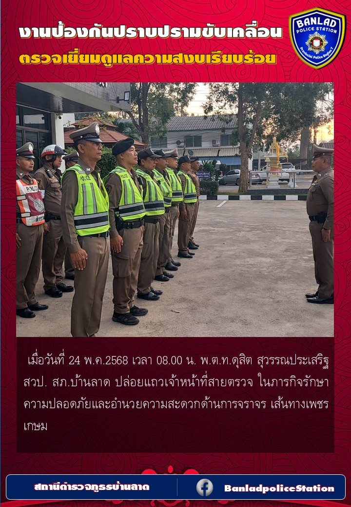 ปล่อยแถวเจ้าหน้าที่สายตรวจ ในภารกิจรักษาความปลอดภัยและอำนวยความสะดวกด้านการจราจร เมื่อวันที่ 24 พ.ค.2568 เวลา 08.00 น. 28 พฤษภาคม 2568 โดย ณัฐวุฒิ เมืองขวัญใจ