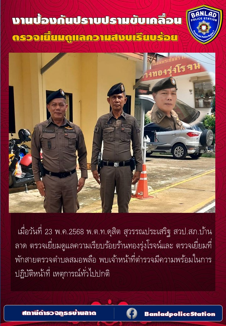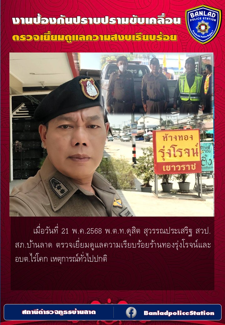 พ.ต.ท.ดุสิต สุวรรณประเสริฐ สวป.สภ.บ้านลาด ตรวจเยี่ยมดูแลความเรียบร้อยร้านทองรุ่งโรจน์และ ตรวจเยี่ยมที่พักสายตรวจสมอพลือ เมื่อวันที่ 23 พ.ค.2568 28 พฤษภาคม 2568 โดย ณัฐวุฒิ เมืองขวัญใจ