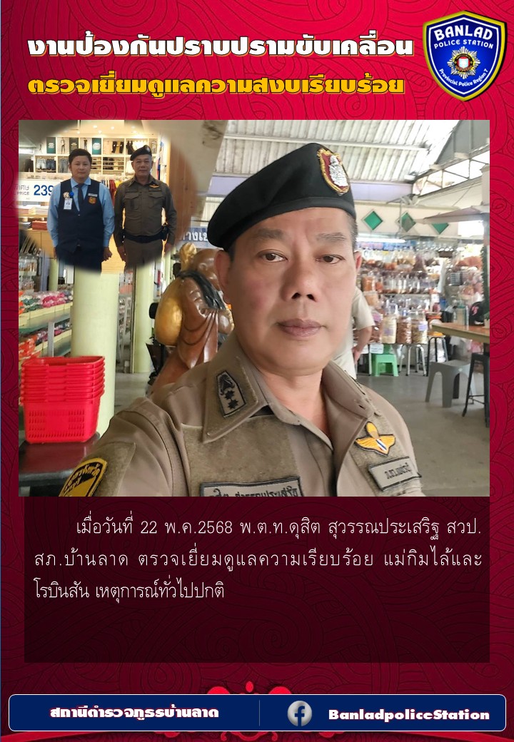 พ.ต.ท.ดุสิต สุวรรณประเสริฐ สวป. สภ.บ้านลาด ตรวจเยี่ยมดูแลความเรียบร้อย แม่กิมไล้และโรบินสัน เมื่อวันที่ 22 พ.ค.2568 23 พฤษภาคม 2568 โดย ณัฐวุฒิ เมืองขวัญใจ