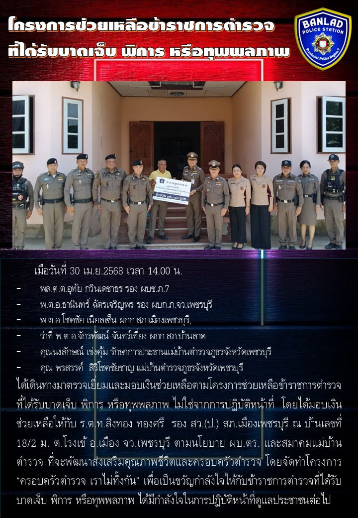ร่วมตรวจเยี่ยมและมอบเงินช่วยเหลือตามโครงการช่วยเหลือข้าราชการตำรวจที่ได้รับบาดเจ็บ พิการ หรือทุพพลภาพ ไม่ใช่จากการปฏิบัติหน้าที่ เมื่อวันที่ 30 เม.ย.2568 เวลา 14.00 น. 2 พฤษภาคม 2568 โดย ณัฐวุฒิ เมืองขวัญใจ