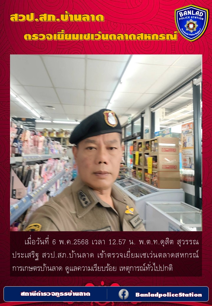 พ.ต.ท.ดุสิต สุวรรณประเสริฐ สวป.สภ.บ้านลาด เข้าตรวจเยี่ยมเซเว่นตลาดสหกรณ์การเกษตรบ้านลาด เมื่อวันที่ 6 พ.ค.2568 เวลา 12.57 น. 7 พฤษภาคม 2568 โดย ณัฐวุฒิ เมืองขวัญใจ