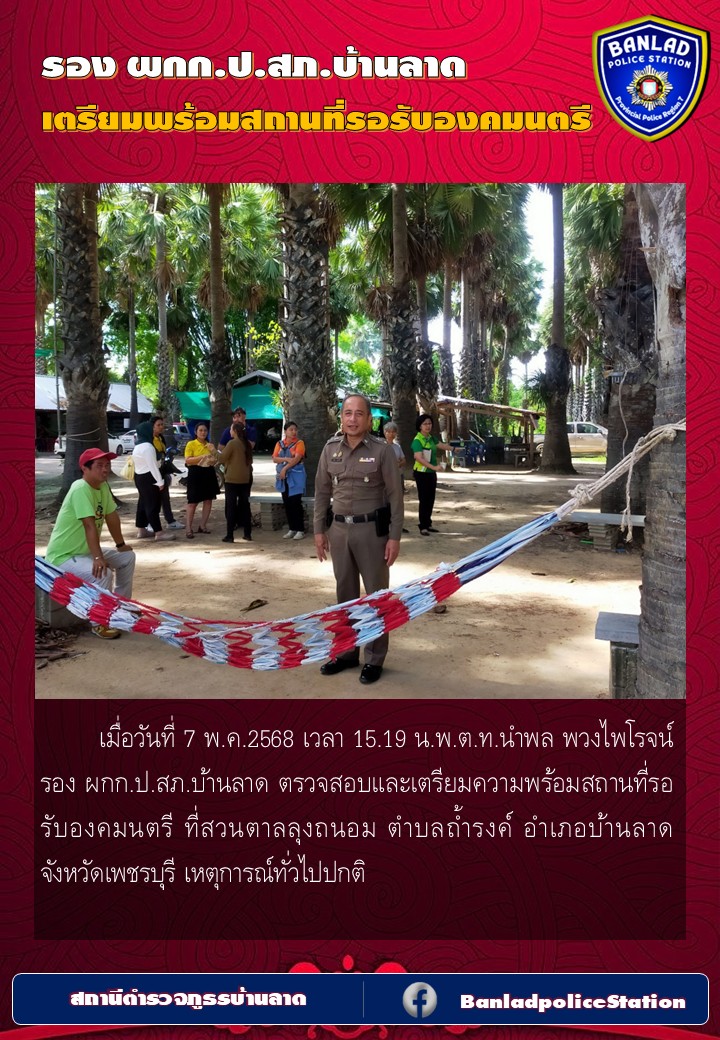 พ.ต.ท.นำพล พวงไพโรจน์ รอง ผกก.ป.สภ.บ้านลาด ตรวจสอบและเตรียมความพร้อมสถานที่รอรับองคมนตรี เมื่อวันที่ 7 พ.ค.2568 เวลา 15.19 น. 8 พฤษภาคม 2568 โดย ณัฐวุฒิ เมืองขวัญใจ