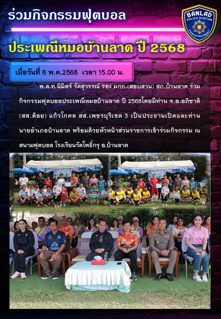 พ.ต.ท.นิมิตร์ วัดสุวรรณ์ รอง ผกก.(สอบสวน) สภ.บ้านลาด ร่วมกิจกรรมฟุตบอลประเพณีหมอบ้านลาด ปี 2568 เมื่อวันที่ 6 พ.ค.2568 เวลา 15.00 น. 7 พฤษภาคม 2568 โดย ณัฐวุฒิ เมืองขวัญใจ