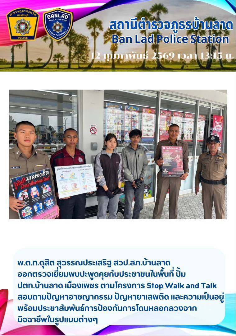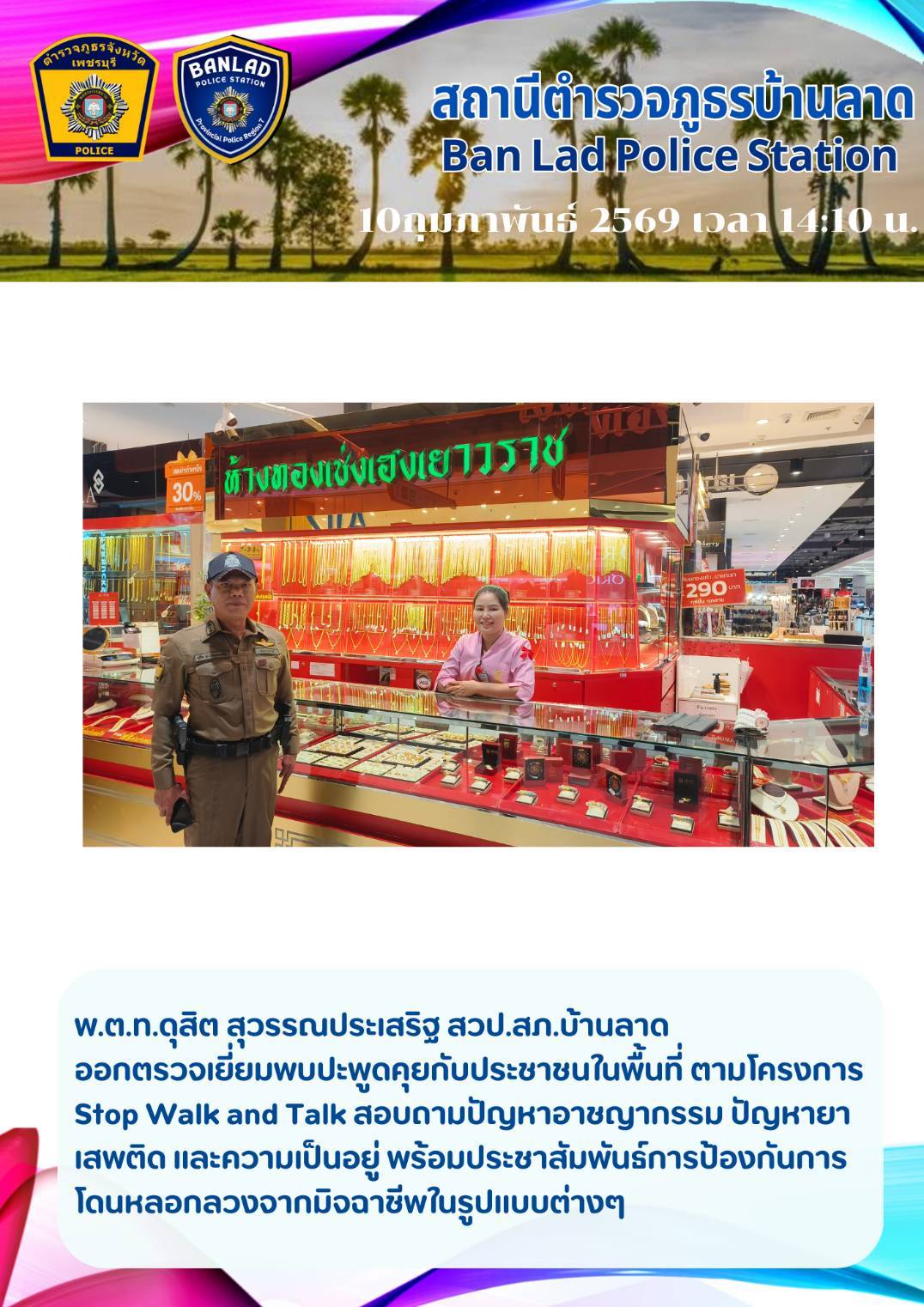 พ.ต.ท.ดุสิต สุวรรณประเสริฐ สวป.สภ.บ้านลาด ตรวจเยี่ยมพบปะประชาชน ตามโครงการ (Stop Walk & Talk) เพื่อสร้างความมั่นใจให้กับประชาชน เมื่อวันที่ 12 ก.พ.2569 เวลา 13.15 น. 17 กุมภาพันธ์ 2569 โดย ณัฐวุฒิ เมืองขวัญใจ
