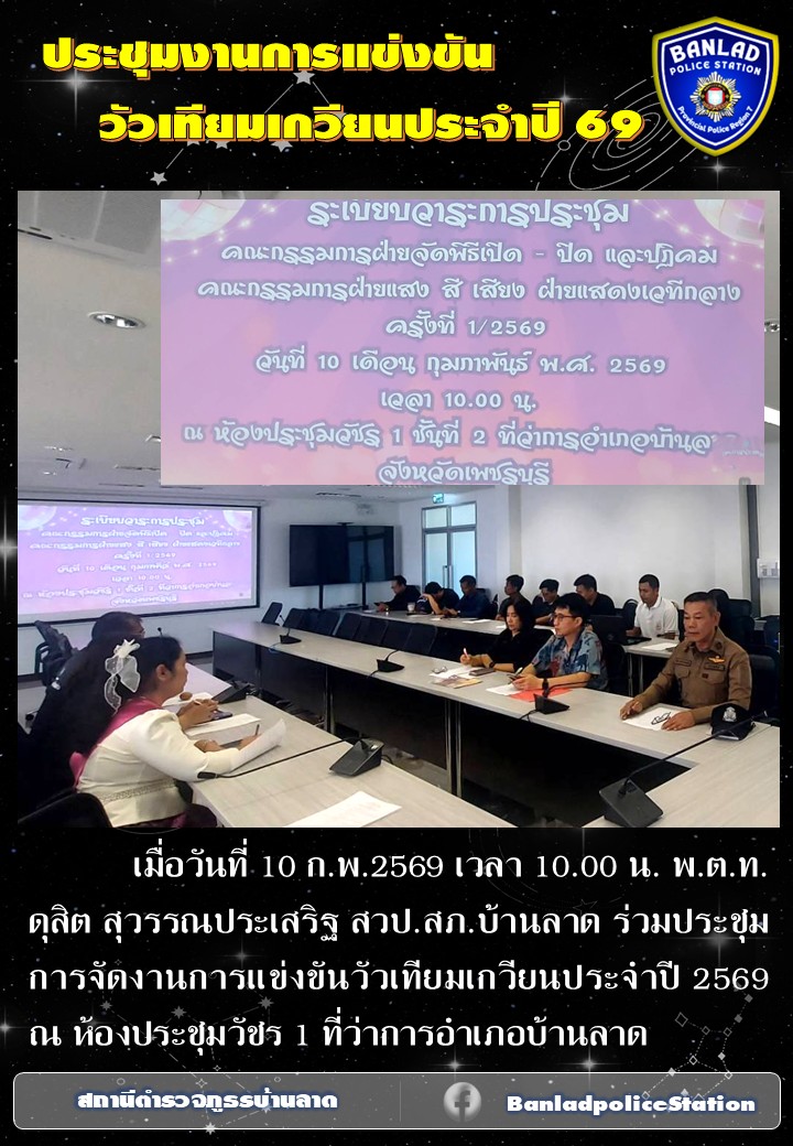 พ.ต.ท.ดุสิต สุวรรณประเสริฐ สวป.สภ.บ้านลาด ร่วมประชุมการจัดงานการแข่งขันวัวเทียมเกวียนประจำปี 2569 เมื่อวันที่ 10 ก.พ.2569 เวลา 10.00 น. 17 กุมภาพันธ์ 2569 โดย ณัฐวุฒิ เมืองขวัญใจ