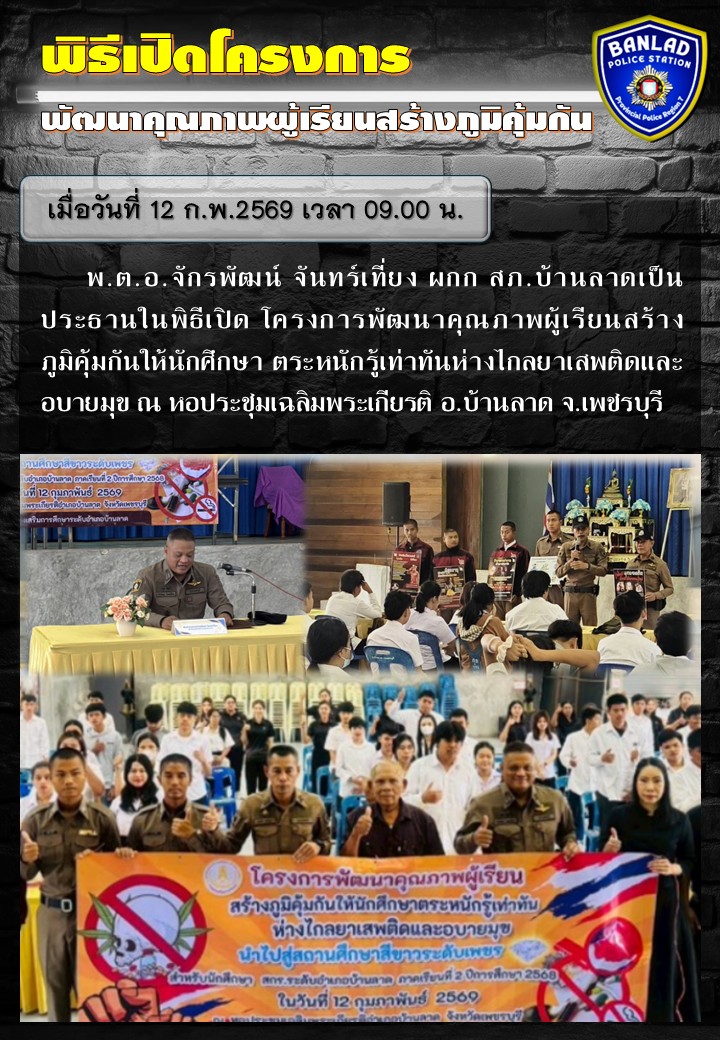 พ.ต.อ.จักรพัฒน์ จันทร์เที่ยง ผกก สภ.บ้านลาดเป็นประธานในพิธีเปิด โครงการพัฒนาคุณภาพผู้เรียนสร้างภูมิคุ้มกันให้นักศึกษาฯ เมื่อวันที่ 12 ก.พ.2569 เวลา 09.00 น. 17 กุมภาพันธ์ 2569 โดย ณัฐวุฒิ เมืองขวัญใจ