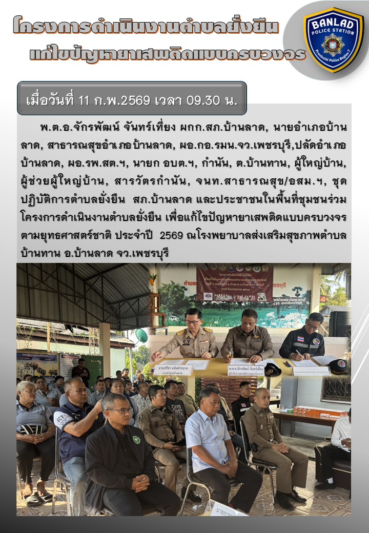 พ.ต.อ.จักรพัฒน์ จันทร์เที่ยง ผกก.สภ.บ้านลาด ร่วมโครงการดำเนินงานตำบลยั่งยืน เพื่อแก้ไขปัญหายาเสพติดแบบครบวงจรฯ เมื่อวันที่ 11 ก.พ.2569 เวลา 09.30 น. 17 กุมภาพันธ์ 2569 โดย ณัฐวุฒิ เมืองขวัญใจ