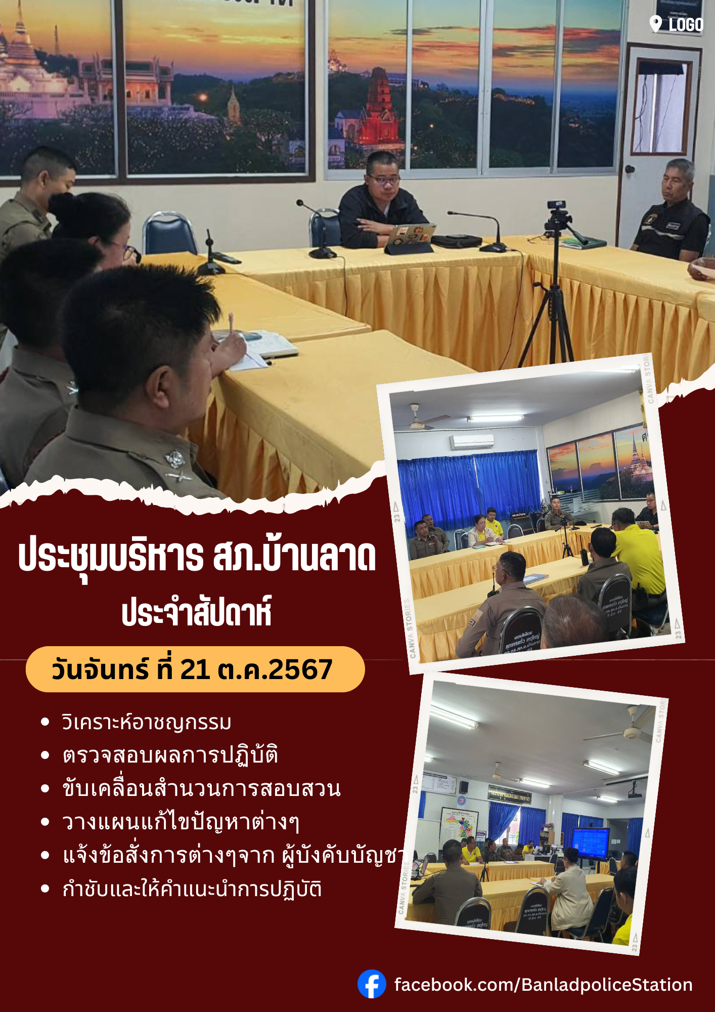 ประชุมบริหาร สภ.บ้านลาด ประจำสัปดาห์ วันที่ 21 ต.ค.67 เวลา 08.30 น.
