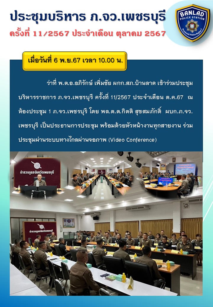 ประชุมบริหาร สภ.บ้านลาด ประจำเดือน พฤศจิกายน วันที่ 4 พ.ย.67 เวลา 09.00 น.