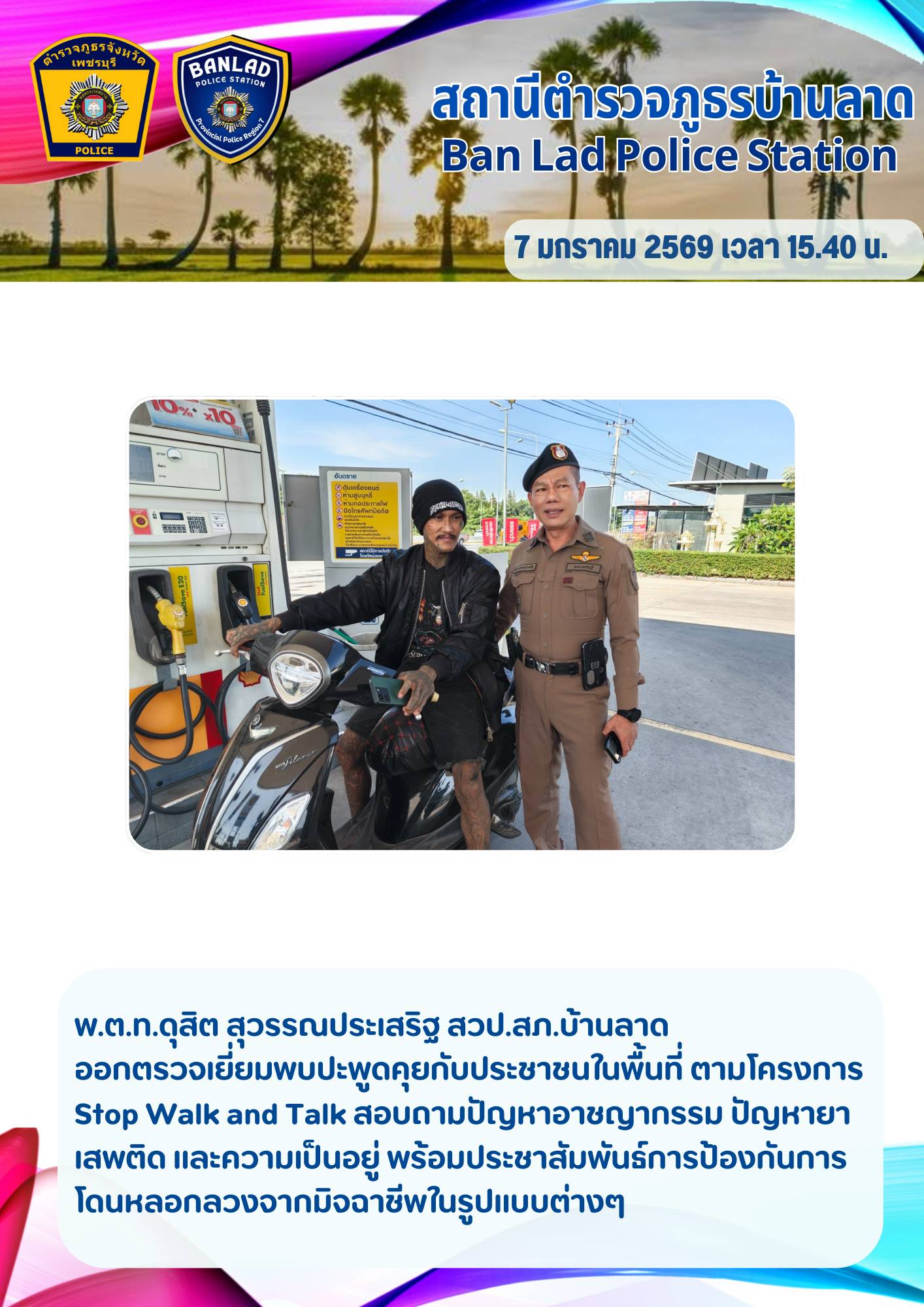 พ.ต.ท.ดุสิต สุวรรณประเสริฐ สวป.สภ.บ้านลาด ตรวจเยี่ยมพบปะประชาชน ตามโครงการ (Stop Walk & Talk) เมื่อวันที่ 7 ม.ค.2569 เวลา 15.40 น. 12 มกราคม 2569 โดย ณัฐวุฒิ เมืองขวัญใจ