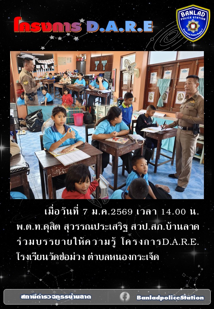 พ.ต.ท.ดุสิต สุวรรณประเสริฐ สวป.สภ.บ้านลาด ร่วมบรรยายให้ความรู้ โครงการD.A.R.E.โรงเรียนวัดช่อม่วง เมื่อวันที่ 7 ม.ค.2569 เวลา 14.00 น. 8 มกราคม 2569 โดย ณัฐวุฒิ เมืองขวัญใจ
