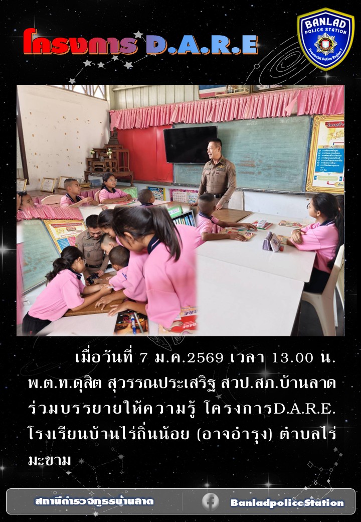 พ.ต.ท.ดุสิต สุวรรณประเสริฐ สวป.สภ.บ้านลาด ร่วมบรรยายให้ความรู้ โครงการD.A.R.E. โรงเรียนบ้านไร่ถิ่นน้อย เมื่อวันที่ 7 ม.ค.2569 เวลา 13.00 น. 8 มกราคม 2569 โดย ณัฐวุฒิ เมืองขวัญใจ