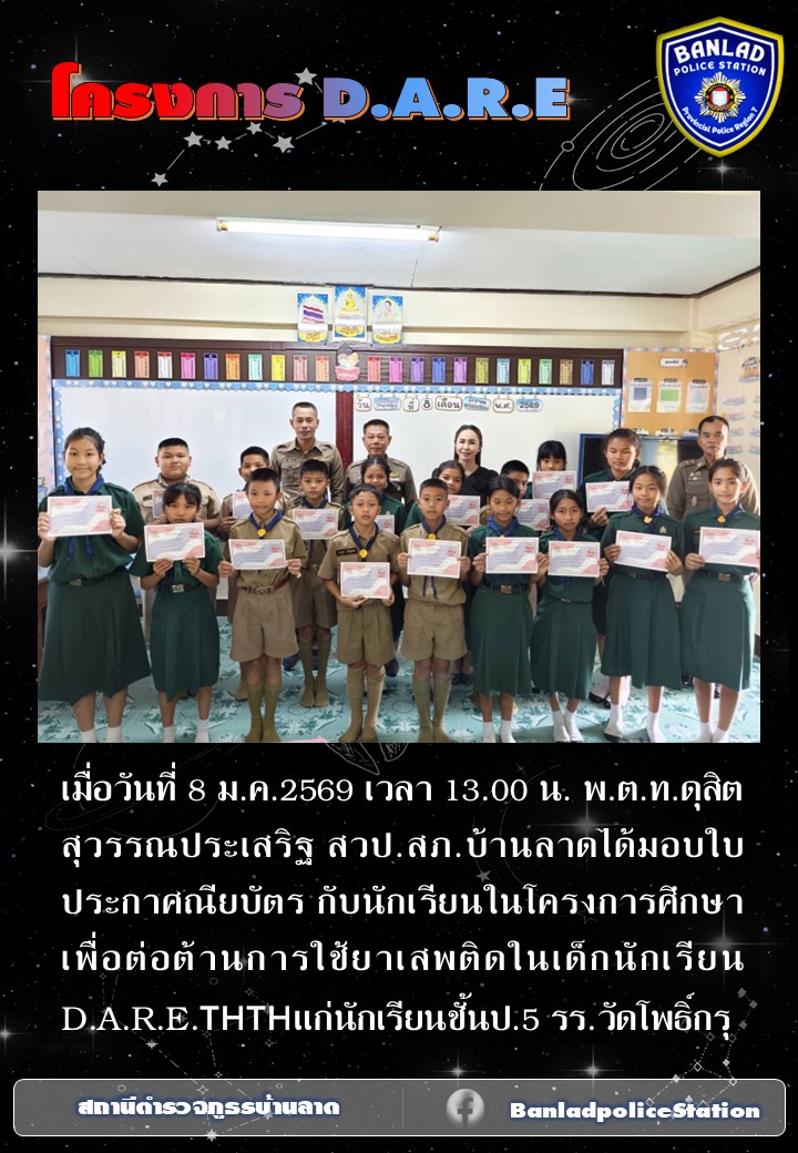 พ.ต.ท.ดุสิต สุวรรณประเสริฐ สวป.สภ.บ้านลาดได้มอบใบประกาศณียบัตร กับนักเรียนในโครงการศึกษาเพื่อต่อต้านการใช้ยาเสพติด เมื่อวันที่ 8 ม.ค.2569 เวลา 13.00 น. 12 มกราคม 2569 โดย ณัฐวุฒิ เมืองขวัญใจ