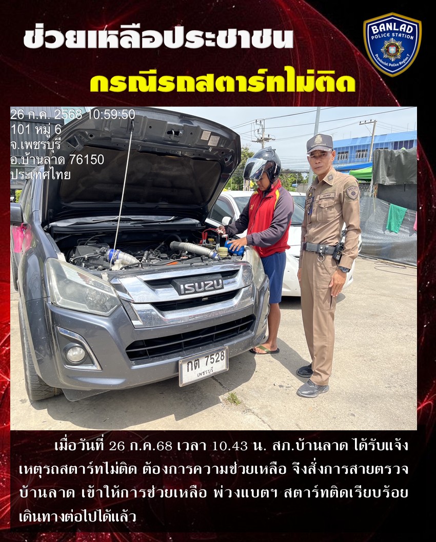 สายตรวจตำบลบ้านลาด ให้ความความช่วยเหลือประชาชน กรณีรถสตาร์ทไม่ติด เมื่อวันที่ 26 ก.ค.68 เวลา 10.43 น. 31 กรกฎาคม 2568 โดย ณัฐวุฒิ เมืองขวัญใจ