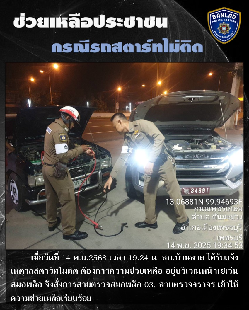 สายตรวจสมอพลือ 03, สายตรวจจราจร ให้ความช่วยเหลือประชาชน กรณีรถสตาร์ทไม่ติด เมื่อวันที่ 14 พ.ย.2568 เวลา 19.24 น. 19 พฤศจิกายน 2568 โดย ณัฐวุฒิ เมืองขวัญใจ